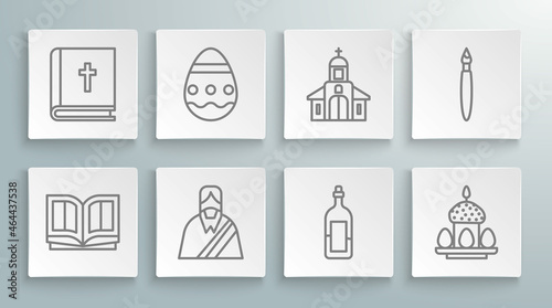 Set line Holy bible book, Easter egg, Jesus Christ, Bottle of wine, cake and eggs, Church building, Paint brush and icon. Vector