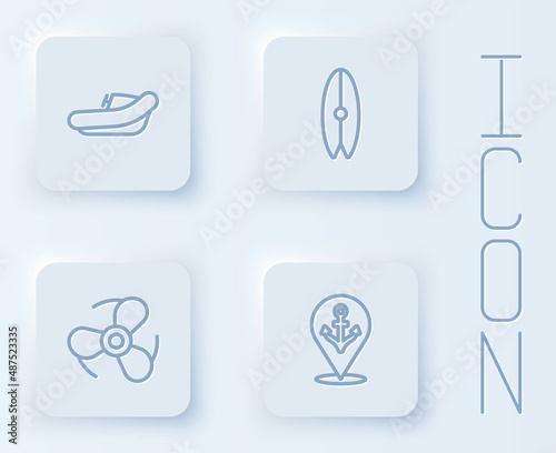 Set line Inflatable boat with motor, Surfboard, Boat propeller and Location anchor. White square button. Vector