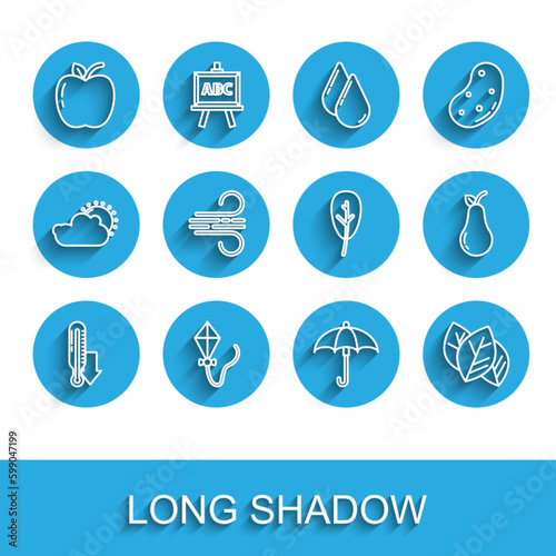 Set line Meteorology thermometer, Kite, Apple, Umbrella, Leaf leaves, Wind, Pear and icon. Vector