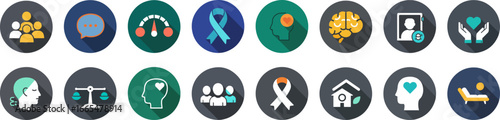Set of 16 flat circular icons with muted blue, green, yellow, and white colors on gray background