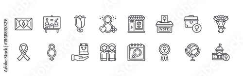 set of 16 thin line womens day icons such as letter, ribbon, presentation,, rose, gift, eight, hug, shop. editable stroke vector illustration isolated on white