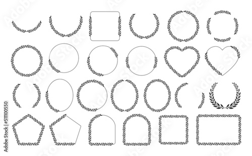Set of 25 black laurel wreaths. Leaves and branches are round and semicircular in shape. Wreaths for images of awards, heraldry, achievements, victories. Vector illustration for design.