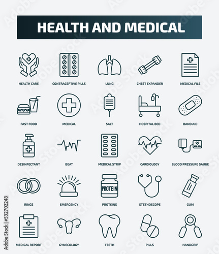 set of 25 special lineal health and medical icons. outline icons such as health care, contraceptive pills, medical file, salt, desinfectant, cardiology, emergency, gum, teeth, pills line icons.
