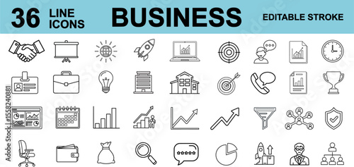 Set of 36 editable line icons related to business and finance. Includes icons for data analysis, investment growth, communication, teamwork, time management, and strategy. Simple, modern outline style