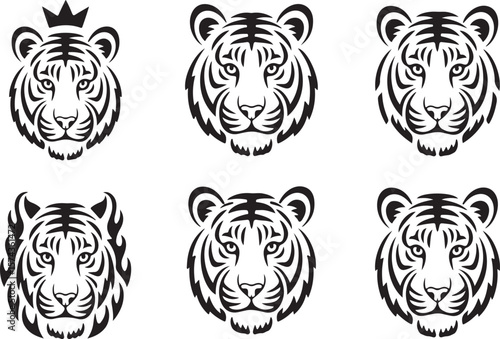 "Set of 6 Stylized Black and White Tribal Tiger Head Icons with Unique Elements (Flames, Crown, Minimalist Variants)"