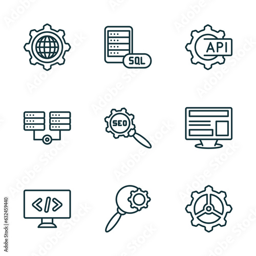 set of 9 linear icons from seo concept. outline icons such as cyberspace, mysql, api, seo tags, search, cogwheel vector