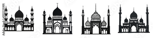 set of A black laser-cut wall hanging depicting an Islamic mosque, on PNG format Transparent Background