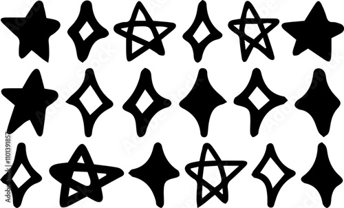 Set of abstract star and diamond shapes in bold and minimalist styles, vector designs perfect for patterns, backgrounds, decorations, and modern graphic projects.