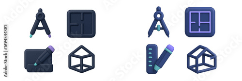 Set of architectural design and construction planning tools including compass, floor plan, pencil, and house structure icons