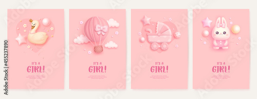 Set of baby shower invitation with cartoon swan, hot air balloon, baby carriage and rabbit on pink background. It's a girl. Vector illustration
