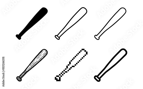 Set of baseball bat icons: silhouette, outline, halftone, pixel, and more