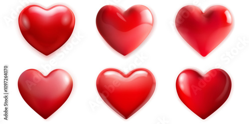 Set of beautiful red hearts with glares and soft shadows, isolated on white background