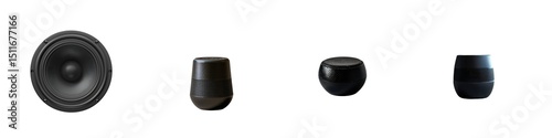 Set of black smart speakers and bluetooth sound devices isolated on transparent background PNG