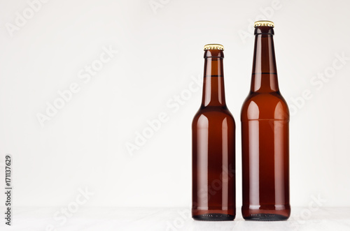 beer, bottle, blank, brown, dark, amber, 2, white, wood, board, background, collection, set, various, different, gloss, sealed, soft, portfolio, advertising, presentation, table, ales, cardboard box, label, mock-up, glasses, brand, company, concept, design, drink, beverage, template, product, lager, craft, clean, container, simple, minimalist, clear, bottle, alcohol