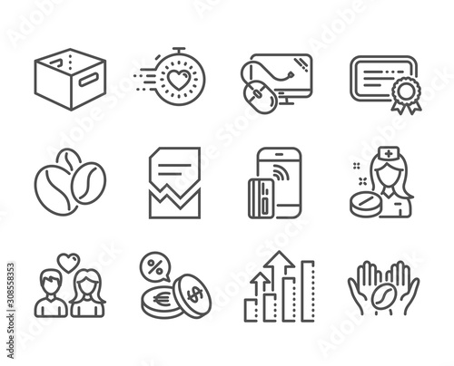 Set of Business icons, such as Computer mouse, Currency exchange, Contactless payment, Nurse, Coffee, Coffee beans, Office box, Certificate, Timer, Couple love, Analysis graph line icons. Vector