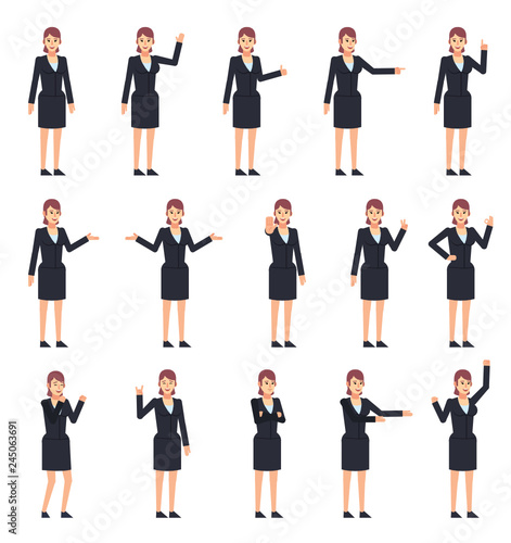 Set of businesswoman characters showing various hand gestures. Woman in dark suit pointing, greeting, showing thumb up, victory hand and other gestures. Flat design vector illustration