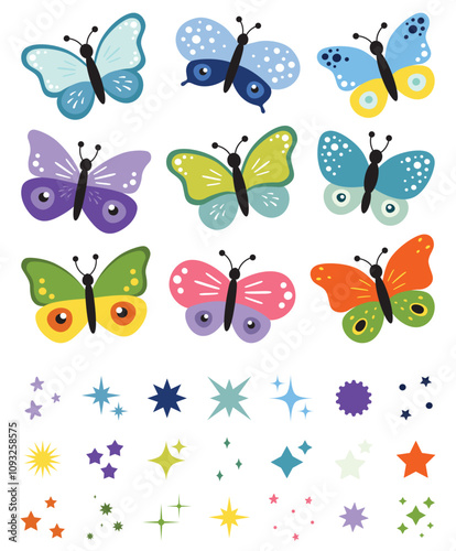 Set of color butterflies, collection of silhouettes. Butterfly colorful, flying shape, vector design. Abstract modern monarch butterfly contours for decoration. Magical sparkle, glow, stars, shine set