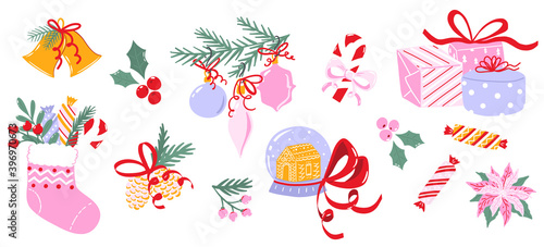 Set of colorful Christmas illustrations isolated on white background. Collection of cute winter stickers. Holiday theme art for greeting card design