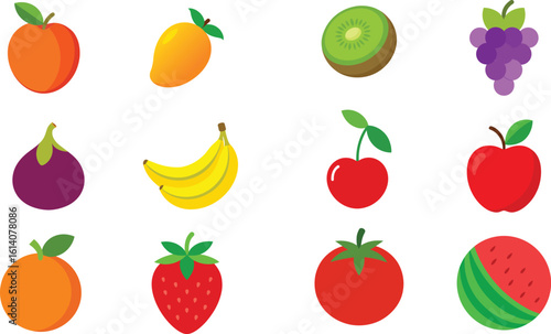 Set of Colorful fruits vector. Editable eps file illustration Apple, Bananas, Cherry, Fig, Grapes, Kiwi, mango, Nectarine, Orange, Strawberry, Tomato, Watermelon