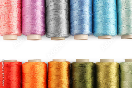 Set of colorful sewing threads on white background, flat lay. Space for text
