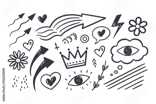 Set of Crayon Doodle Icons. Childish Punk Scribbles with Arrows, Spirals, Hearts, Crowns, Trees, Clouds, Flowers, Mermaid Scales, Houses, and Grungy Charcoal Elements