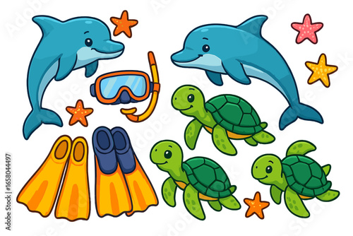 dolphin, turtle, starfish, snorkel, mask, fin, sea, animal, cartoon, illustration, vector, set, cute, ocean, marin, summer, vacation, diving, swimming, underwater, icon, collection, sticker, design, flipper, water, travel, beach, holiday, nature, wildlife, life, isolated, clip art, element, happy, colourful, baby, children, children, playful, character, fun, sea turtle, starfish, equipment