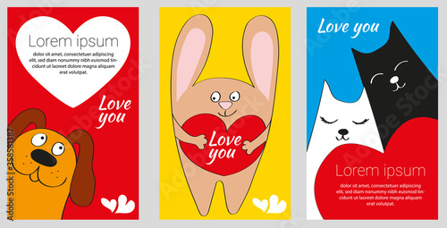 Set of cute romantic vertical cards with the inscription Love you and a place for text. Vector design concept for valentines day. Happy Cats, dog, hare. Greeting card, invitation, poster, banner, web.