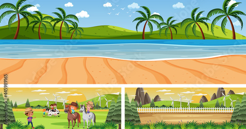 Set of different outdoor panoramic landscape scenes with cartoon character