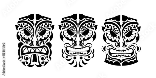 Set of faces of devils in ornament style. Polynesian, Maori or Hawaiian tribal patterns. Good for prints, tattoos, and t-shirts. Isolated. Vector illustration.