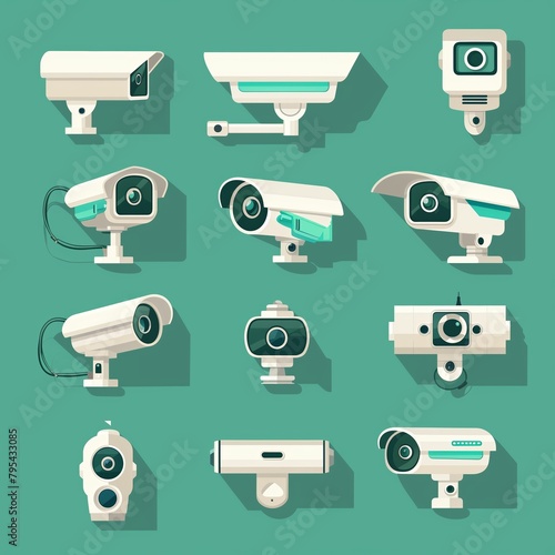 Set of flat vector designs of security cameras in green background