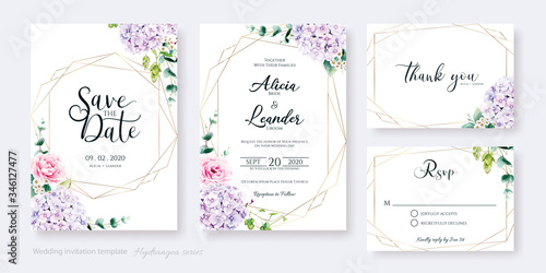 set, hydrangea, wedding, card, invitation, pink, purple, decorative, thank you, date, save, greenery, congratulation, love, elegant, overlap, gold, invite, branch, tree, climber, garden, plant, border, floral, flower, cool, beautiful, pattern, vector, leaf, summer, copy space, letter, vintage, graphic, chaplet, element, celebration, nature, ornament, template, leaf, frame, decoration, greeting, art, design, background, illustration