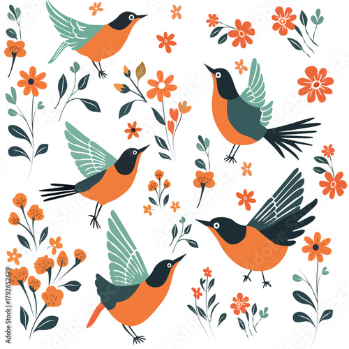 background, vector, flower, design, fashion, vintage, art, hand, illustration, leaf, cartoon, floral, orange, wallpaper, cute, graphic, bird, plant, doodle, flat, fabric, drawing, ornament, bird, modern, set, beautiful, element, textile, decoration, decorative, botanical, blossom, flora, element, folk, stylised, symbol, birdie, drawn, national, style, seamless, pattern, tree branch, card, summer
