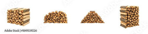 Set of four chopped firewood piles with natural bark, neatly stacked in various geometric shapes including a rectangle, arch, triangle, and a tall column