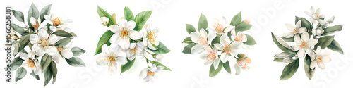 Set of four watercolor white floral arrangements with green leaves, isolated on transparent background