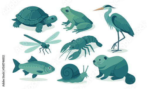 turtle, frog, heron, dragonfly, crayfish, beaver, snail, fish, wetland, fresh water, duck pond, river, amphibian, aquatic, insect, crustacean, bird, mammal, shell, wing, leg, tail, claw, antennae, eye, foot, animal, wildlife, nature, green, teal, blue, vector, illustration, cartoon, flat, drawing, creature, character, water, environment, isolated, group, set, concept, print, sticker, poster, greeting
