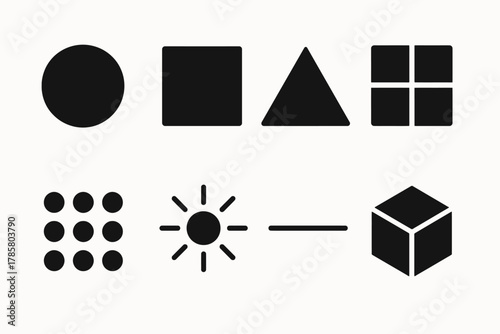 geometric, shape, circle, square, triangle, grid, sun, line, cube, black, symbol, design, minimal, abstract, symmetry, basic, rectangle, polygon, monochrome, illustration, dot, pattern, form, silhouette, geometry, simple, element, graphic, modern, flat, icon, vector