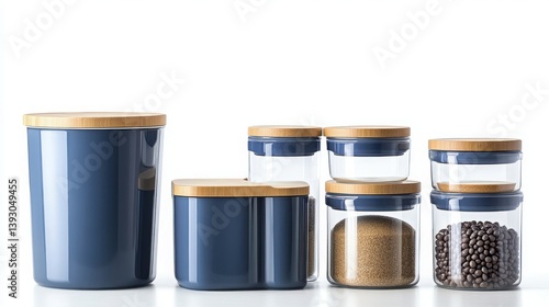 kitchen, storage, container, jar, glasses, ceramic, navy blue, cookware, kitchen utensile, tableware, home decor, interior, organisation, cook, baking, food, spice, coffee bean, sugar, flour, still life, website, banner, presentation, background