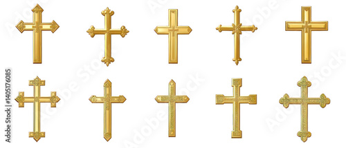 Set of golden Christian crosses isolated on transparent background