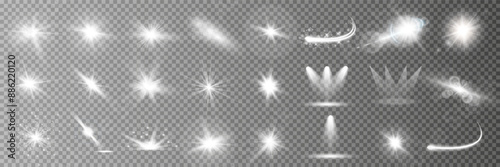 Set of golden glowing lights effects isolated on transparent background. Sun flash with rays and spotlight. Glow light effect. Star burst with sparkles.