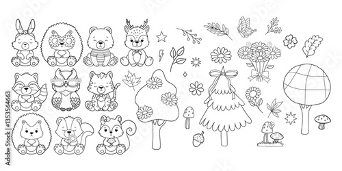activity, animal, bear, book, cartoon, character, children, children, collection, cute, cervid, different, disco, doodle, flower, forest, groovy, hand-drawn, hedgehog, illustration, jungle, children, leaf, leaves, line, line art, minimal, mushroom, outline, owl, pine tree, pose, rabbit, retro, safari, set, to sit, skunk, sleep, squirrel, stamp, sunglasses, tiger, vector, timberland