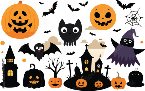halloween, pumpkin, autumn, bat, vector, night, holiday, moon, horror, illustration, scarey, tree, skittish, october, dark, sorcerer, celebration, design, silhouette, black, cartoon, orange, ghost, set, fear