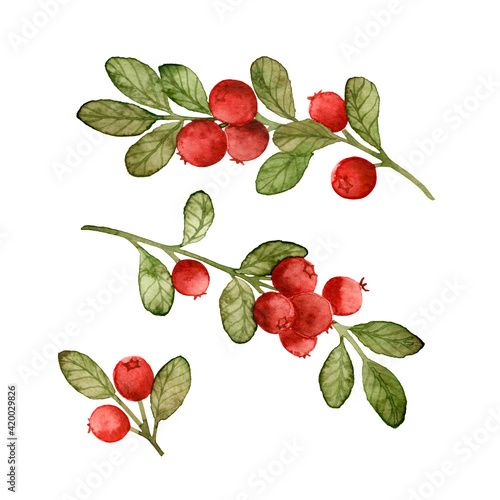 Set of hand drawn watercolor twigs of lingonberry isolated on white background. Red forest berries. Botanical illustration.