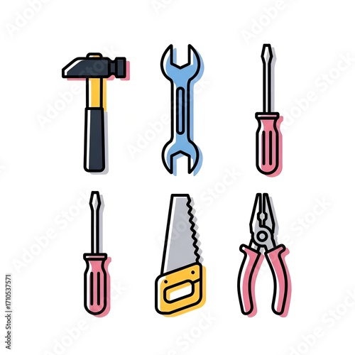 hammer, wrench, screwdriver, saw, plier, tool, hand, repair, equipment, hardware, construction, work, industry, maintenance, building, fix, spanner, carpenter's shop, engineer, instrument, service, improvement, steel, metal, workshop, job, men at work, house, object, symbol