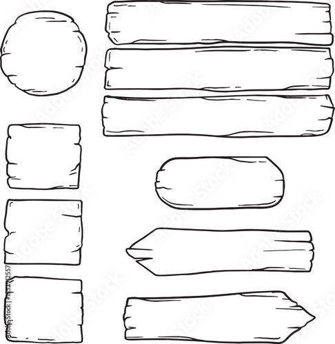 set of hand-drawn blank wooden signs, planks, and directional arrows in various shapes. These rustic and versatile doodle elements are perfect for adding custom text, titles.