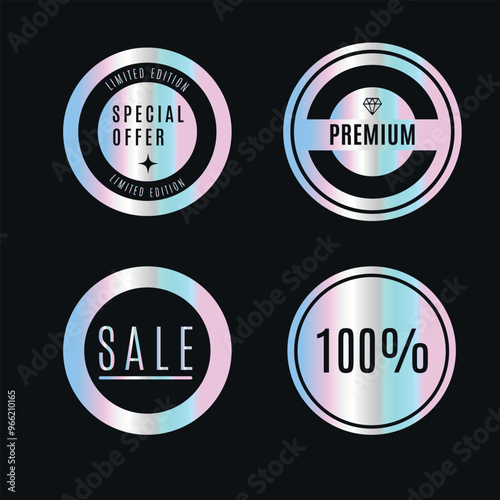 Set of hologram sticker. Label SPECIAL OFFER, PREMIUM, SALE, 100%. Emblem for web design, e-commerce and any products. Vector illustration