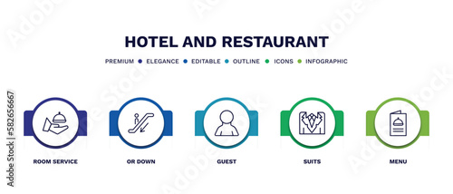 set of hotel and restaurant thin line icons. hotel and restaurant outline icons with infographic template. linear icons such as room service, or down, guest, suits, menu vector.