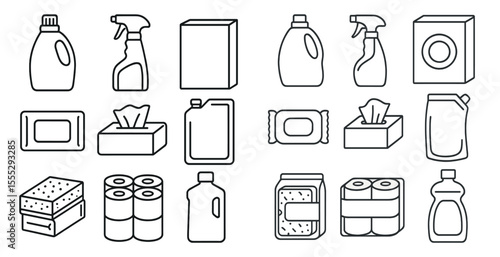 Set of household items including paper towels, toilet paper, and cleaning supplies. The image is in black and white and has a minimalist feel