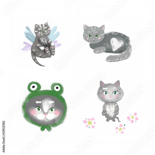 Set of illustrations of kittens. Cute gray kittens with green eyes. Stickers, prints for notebooks, clothes, packaging. Cartoon style. Illustrations on a white background.