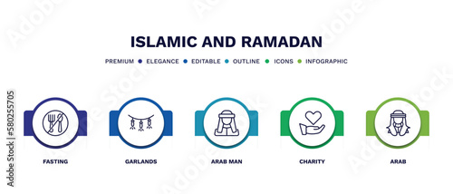 set of islamic and ramadan thin line icons. islamic and ramadan outline icons with infographic template. linear icons such as fasting, garlands, arab man, charity, arab vector.