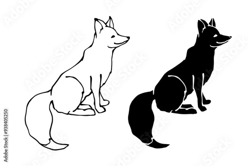 Set of linear sketches, silhouettes of a predatory forest animal fox. Vector graphics.